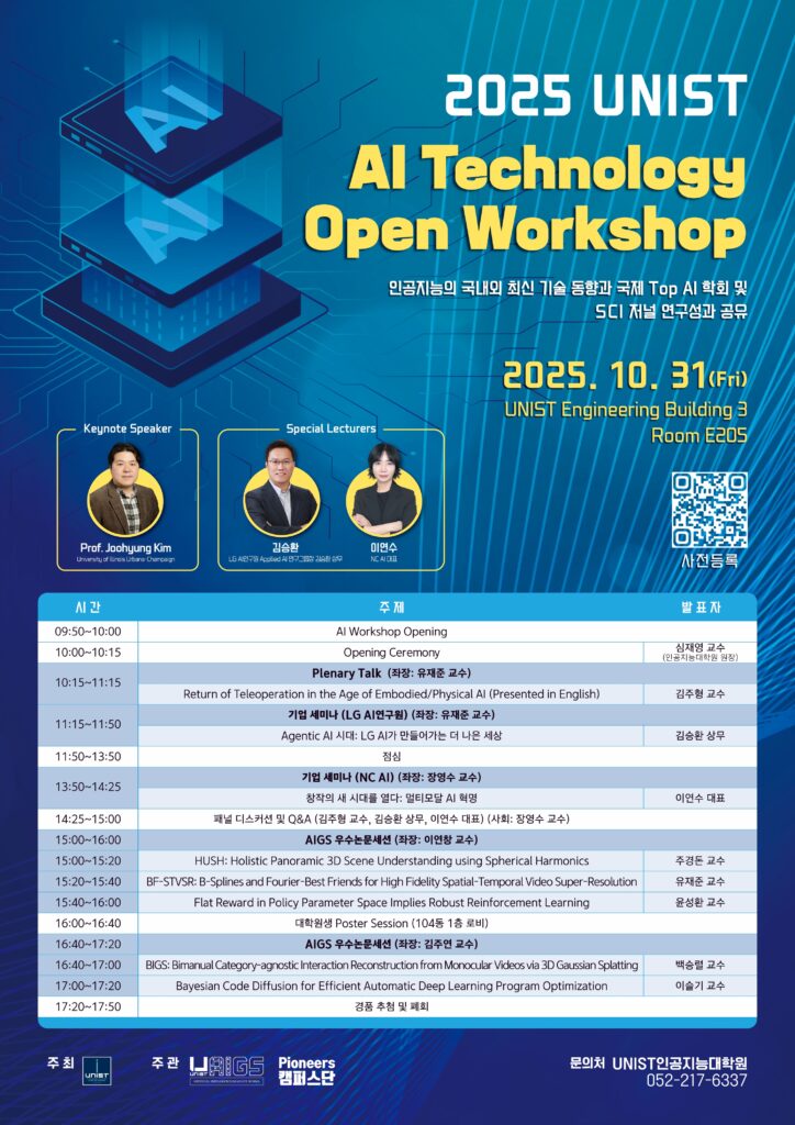 UNIST(총장 박종래) 인공지능대학원이 31일, 106동 공학관에서 ‘2025 인공지능 기술 공개 워크숍’을 열었다. 행사장에는 미국 일리노이대 석학, LG AI연구원과 NC AI 대표 등 산업계 AI 전문가와 연구진 400여 명이 한자리에 모였다. 이번 워크숍은 급변하는 AI 기술의 동향을 공유하고, 2025년 UNIST 연구 성과를 조명하기 위해 마련됐다. 강연과 논문 발표, 학생 연구 전시 등 다양한 세션이 이어지며, 학계와 산업계의 활발한 교류가 이뤄졌다. 심재영 인공지능대학원장은 환영사에서 “AI가 산업 전반을 재편하는 시점에서 이번 행사는 학계와 산업계의 연구자들이 미래 방향을 함께 모색하는 기회”라고 강조했다. 기조강연에는 김주형 일리노이대학교 어배너-섐페인(UIUC) 교수가 로봇과 물리적 인공지능 환경에서의 ‘원격조작 기술의 재부상’을 소개했다. 이어 김승환 LG AI연구원 어플라이드 AI 연구그룹장은 ‘Agentic AI 시대: LG AI가 만들어가는 더 나은 세상’을, 이연수 NC AI 대표는 ‘창작의 새 시대를 열다: 멀티모달 AI 혁명’을 주제로 발표했다. 참석자들은 AI 기술 진화가 인간과 산업 전반에 가져올 변화를 논의했다. ‘AI와 인간의 협력 방식은 앞으로 어떻게 달라질까’, ‘새로운 AI 기술이 산업 생태계와 직업 구조에 어떤 영향을 미칠까’ 등 구체적인 질문으로 활발한 의견이 오갔다. 이어 UNIST 인공지능대학원 주경돈·유재준·윤성환·백승렬·이슬기 교수는 세계적 학술지에 게재한 우수 연구 성과를 발표했다. 이들은 △3D 장면 이해 △비디오 초해상도 △강화학습 △영상 기반 인간-물체 상호작용 복원 △베이지안(확률 모델) 기반 코드 최적화 등 주요 분야에서 AI 표현력과 연산 효율성을 동시에 끌어올리는 독창적 모델링 기법을 선보였다. 물리적 환경 이해를 정교하게 확장하는 한편, 자동화된 딥러닝 시스템의 최적화 방안을 제시하며 차세대 AI 기술의 폭넓은 응용 가능성을 입증한 것이다. 올해로 5회째를 맞은 이 워크숍은 2021년 첫 개최 이후 지역 혁신 AI 생태계를 견인하고 있다. 심 원장은 “UNIST AI 워크숍이 산학연 협력을 통한 AI 혁신의 촉매 역할을 하는 대표 학술행사로 자리잡고 있다”고 말했다. UNIST는 2020년 인공지능대학원 설립 이후 ‘AI 노바투스 아카데미아’와 ‘노바투스대학원’, ‘AI 최고경영자과정’ 등을 통해 지역 산업 혁신을 위한 첨단 연구와 인재 양성에 힘쓰고 있다. (끝) |