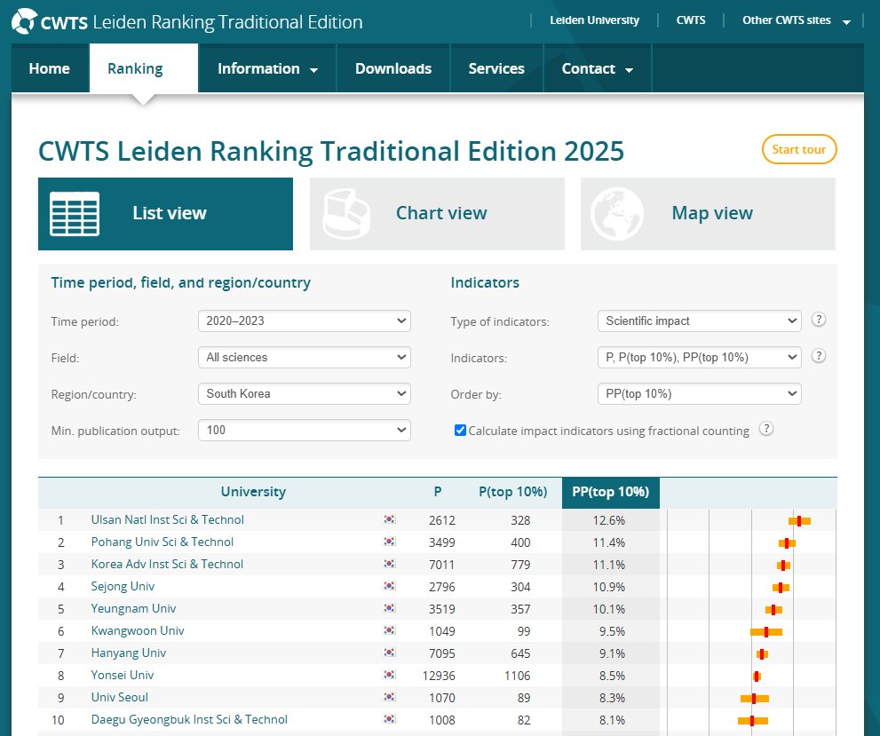 UNIST(총장 박종래)가 논문의 질을 평가하는 네덜란드 라이덴랭킹에서 9년 연속 국내 1위를 지켰다. 꾸준히 높은 수준의 연구 성과를 이어가며 세계 무대에서도 경쟁력 있는 논문의 질을 다시 한번 입증한 것이다. 라이덴대학 과학기술연구센터는 현지 시각으로 지난달 29일, ‘2025 라이덴랭킹(CWTS Leiden Ranking)’을 발표했다. UNIST는 기존과 동일한 방식으로 SCI 논문 성과를 기반으로 순위를 산출한 ‘Traditional Edition’에서 피인용 상위 10% 논문 비율 12.6%를 보이며 국내 1위, 세계 203위에 올랐다. UNIST는 2017년 처음 순위에 진입한 이후 9년 연속 국내 1위 자리를 굳건히 했다. 올해는 전년 대비 상위 논문 비율이 다소 소폭 감소했음에도 1위를 달성하며 연구 경쟁력을 보여줬다. 특히, 논문 기여도를 공동저자 수에 따라 나눠 산정하는 ‘분수 계산(fractional counting)’ 기준에서도 국내 1위를 차지했다. 이는 UNIST 연구진의 실질적 기여도가 국내 최고 수준임을 확인한 결과다. 분야별 순위에서도 UNIST 성과는 두드러졌다. 5개 세부 학문 분야 가운데 가장 많은 논문을 발표한 물상과학·공학(Physical Science and Engineering) 분야에서 전년도에 이어 국내 1위를 유지했다. 생명·지구과학(Life and Earth Science) 분야는 세계 순위가 전년 대비 43계단 상승하며 130위권에 들었다. 전통적인 라이덴랭킹은 각 대학이 발표한 SCI 논문의 수와 피인용 상위 10% 논문의 수를 바탕으로 논문의 질적 비중을 평가한다. 4년간 SCI 논문을 800편 이상 출판한 대학만 등재할 수 있다. 2025년 평가에는 전 세계 77개국 1,594개 대학과 국내 52개 대학이 포함됐다. 조사 기간은 2020년부터 2023년까지 발표된 논문이다. 평가 과정에서는 공동 저술에 대한 기여 비율을 조정해 대학별 기여도를 면밀히 따졌다. 올해 평가에서 MIT가 세계 1위를 차지했다. 프린스턴대학교, 캘리포니아공대(Caltech), 하버드대학교, 스탠포드대학교가 5위권을 형성하며 미국 대학 강세가 이어졌다. 국내 대학 순위에서는 UNIST가 1위를 기록했고, 이어서 POSTECH, KAIST, 세종대학교, 영남대학교가 5위권에 속했다. 박종래 총장은 “이번 성과는 UNIST가 세계적으로 주목받는 우수한 연구를 지속적으로 창출하고 있음을 보여준다”라며, “앞으로도 도전적이고 창의적인 연구로 글로벌 과학기술의 흐름을 이끄는 대학으로 성장해 나가겠다”라고 말했다. (끝) |