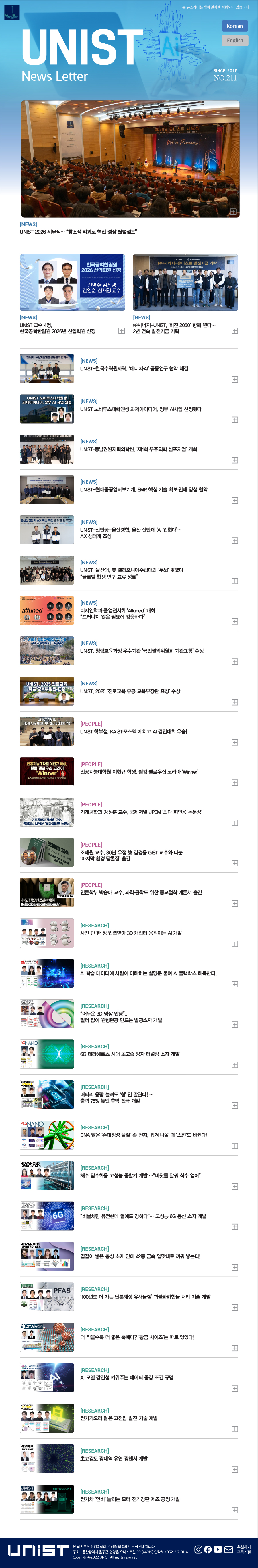 UNIST Korean English UNIST 2026 시무식… “창조적 파괴로 혁신 성장 퀀텀점프” UNIST 교수 4명, 한국공학한림원 2026년 신입회원 선정 ㈜시너지-UNIST, ‘비전 2050’ 향해 뛴다… 2년 연속 발전기금 기탁 UNIST-한국수력원자력, ‘에너지·AI’ 공동연구 협약 체결 UNIST 노바투스대학원생 과제아이디어, 정부 AI사업 선정됐다 UNIST–동남권원자력의학원, ‘제1회 우주의학 심포지엄’ 개최 UNIST-현대중공업터보기계, SMR 핵심 기술 확보·인재 양성 협약 UNIST-산단공-울산경협, 울산 산단에 ‘AI 입힌다’… AX 생태계 조성 UNIST-울산대, 美 캘리포니아주립대와 ‘두뇌’ 맞댔다 “글로벌 학생 연구 교류 성료” 디자인학과 졸업전시회 ‘Attuned’ 개최 “드러나지 않은 필요에 감응하다” UNIST, 청렴교육과정 우수기관 ‘국민권익위원회 기관표창’ 수상 UNIST, 2025 ‘진로교육 유공 교육부장관 표창’ 수상 UNIST 학부생, KAIST·포스텍 제치고 AI 경진대회 우승! 인공지능대학원 이현규 학생, 퀄컴 펠로우십 코리아 ‘Winner’ 기계공학과 강상훈 교수, 국제저널 IJPEM ‘최다 피인용 논문상’ 조재원 교수, 30년 우정 故 김경웅 GIST 교수와 나눈 ‘마지막 환경 담론집’ 출간 인문학부 박승배 교수, 과학·공학도 위한 종교철학 개론서 출간 사진 단 한 장 입력받아 3D 캐릭터 움직이는 AI 개발 AI 학습 데이터에 사람이 이해하는 설명문 붙여 AI 블랙박스 해독한다! “어두운 3D 영상 안녕”.. 필터 없이 원형편광 만드는 발광소자 개발 6G 테라헤르츠 시대 초고속 양자 터널링 소자 개발 DNA 닮은 ‘손대칭성 물질’ 속 전자, 튕겨 나올 때 ‘스핀’도 바뀐다! 배터리 용량 늘려도 ‘힘’ 안 딸린다! … 출력 75% 높인 후막 전극 개발 겹겹이 쌓은 층상 소재 안에 42종 금속 입맛대로 끼워 넣는다! “비닐처럼 유연한데 열에도 강하다”… 고성능 6G 통신 소자 개발 해수 담수화용 고성능 증발기 개발 …“바닷물 달궈 식수 얻어” AI 모델 강건성 키워주는 데이터 증강 조건 규명 더 작을수록 더 좋은 촉매다? ‘황금 사이즈’는 따로 있었다! ‘100년도 더 가는 난분해성 유해물질’ 과불화화합물 처리 기술 개발 초고감도 광대역 유연 광센서 개발 전기가오리 닮은 고전압 발전 기술 개발 전기차 ‘연비’ 늘리는 모터 전기강판 제조 공정 개발 UNIST 홈페이지 인스타그램 페이스북 유튜브 메일 추천하기 구독거절