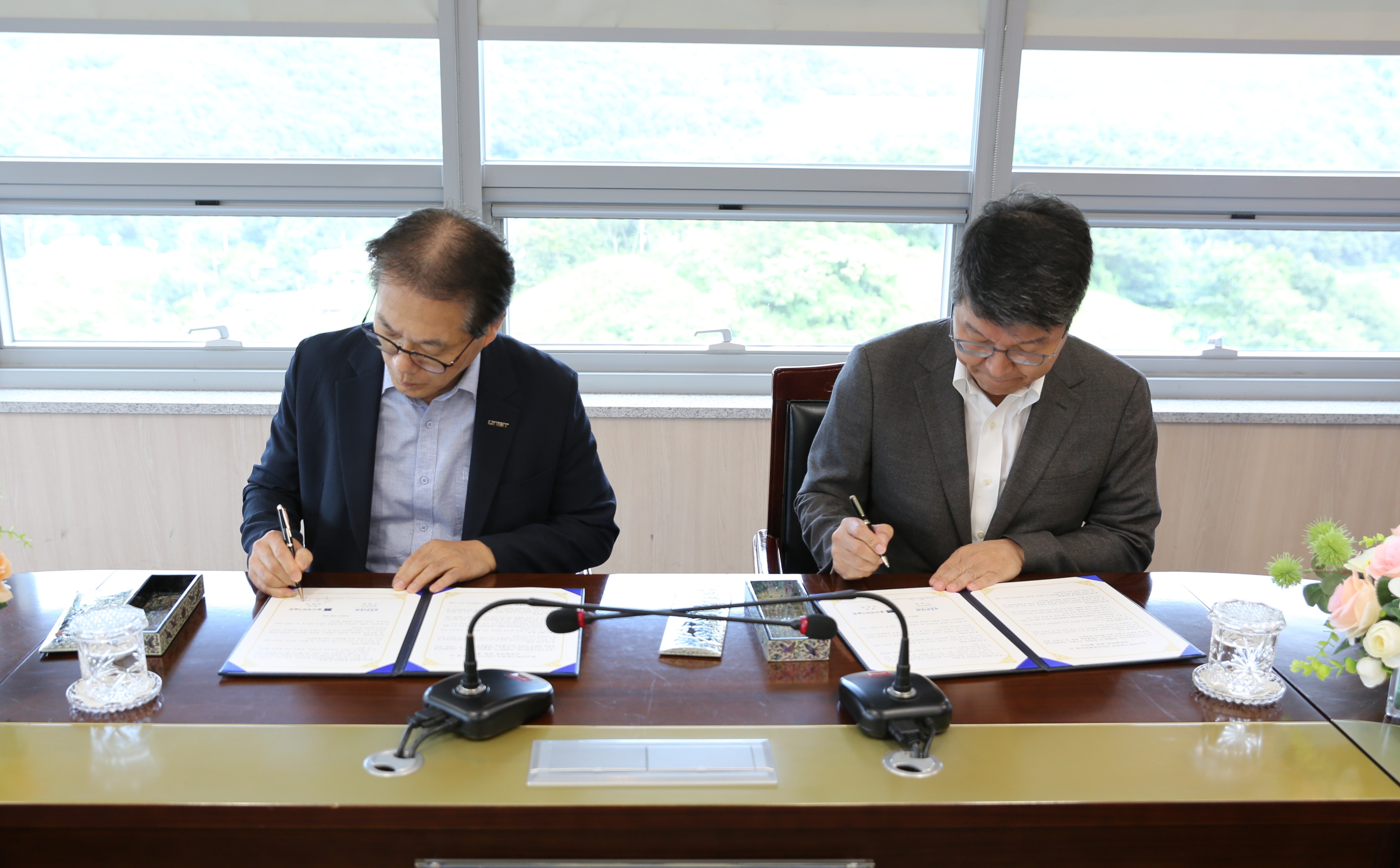 UNIST와 ㈜사피엔반도체가 ‘차세대 반도체 역량 강화 및 산학협력 모델 구축’을 위한 업무협약을 체결했다. 왼쪽부터 김영식 산학협력단장, 박종래 총장, 이명희 대표, 김재준 학술정보처장. | 사진: 특구육성팀