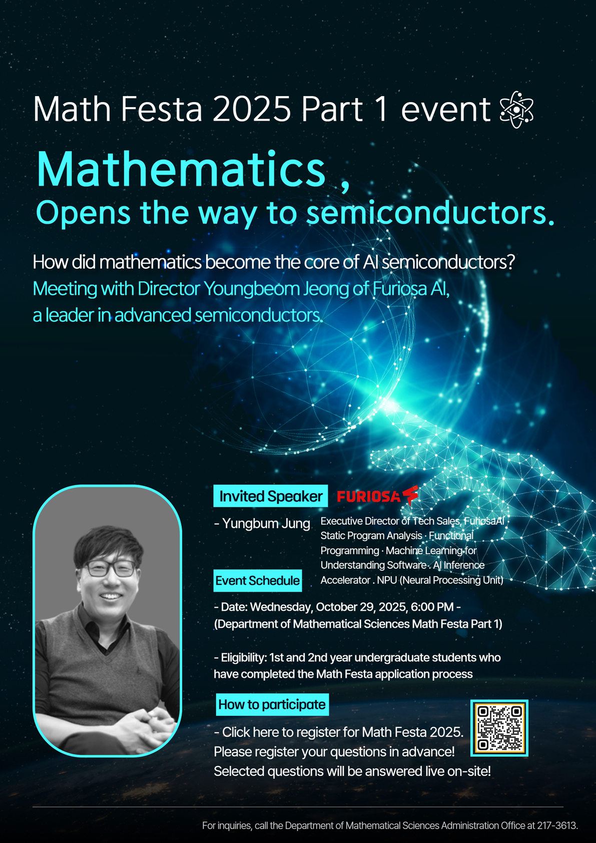 The first part of the event, beginning at 5:30 PM, will feature a talk concert titled ‘Mathematics Opens the Way to Semiconductors.’ Renowned speaker YungBum Jung, Executive Director of Tech Sales at FuriosaAI, will discuss the critical role that mathematics plays in AI semiconductor development.