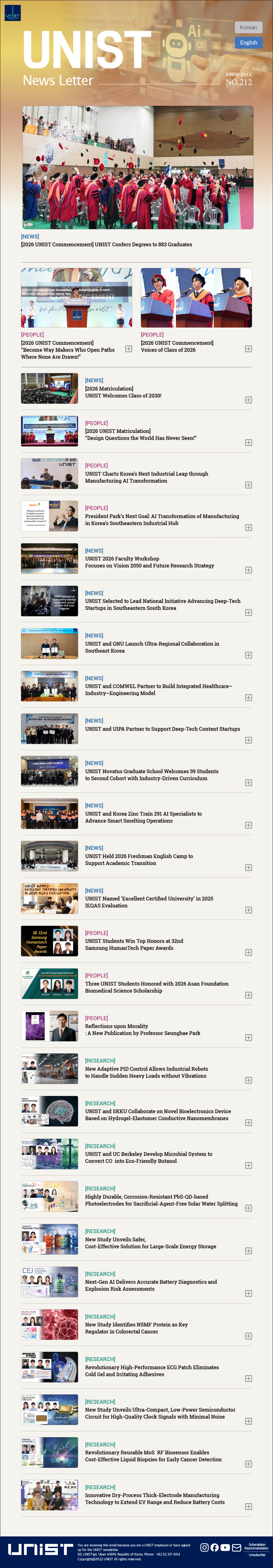 UNIST Korean English [2026 UNIST Commencement] UNIST Confers Degrees to 883 Graduates [2026 UNIST Commencement] “Become Way Makers Who Open Paths Where None Are Drawn!” [2026 UNIST Commencement] Voices of Class of 2026 [2026 Matriculation] UNIST Welcomes Class of 2030! [2026 UNIST Matriculation] “Design Questions the World Has Never Seen!” UNIST Charts Korea’s Next Industrial Leap through Manufacturing AI Transformation President Park’s Next Goal: AI Transformation of Manufacturing in Korea’s Southeastern Industrial Hub UNIST 2026 Faculty Workshop Focuses on Vision 2050 and Future Research Strategy UNIST Selected to Lead National Initiative Advancing Deep-Tech Startups in Southeastern South Korea UNIST and GNU Launch Ultra-Regional Collaboration in Southeast Korea UNIST and COMWEL Partner to Build Integrated Healthcare–Industry–Engineering Model UNIST and UIPA Partner to Support Deep-Tech Content Startups UNIST Novatus Graduate School Welcomes 59 Students to Second Cohort with Industry-Driven Curriculum UNIST and Korea Zinc Train 291 AI Specialists to Advance Smart Smelting Operations UNIST Held 2026 Freshman English Camp to Support Academic Transition UNIST Named ‘Excellent Certified University’ in 2025 IEQAS Evaluation UNIST Students Win Top Honors at 32nd Samsung HumanTech Paper Awards Three UNIST Students Honored with 2026 Asan Foundation Biomedical Science Scholarship Reflections upon Morality: A New Publication by Professor Seungbae Park New Adaptive PID Control Allows Industrial Robots to Handle Sudden Heavy Loads without Vibrations UNIST and SKKU Collaborate on Novel Bioelectronics Device Based on Hydrogel-Elastomer Conductive Nanomembranes UNIST and UC Berkeley Develop Microbial System to Convert CO₂ into Eco-Friendly Butanol Highly Durable, Corrosion-Resistant PbS-QD-based Photoelectrodes for Sacrificial-Agent-Free Solar Water Splitting New Study Unveils Safer, Cost-Effective Solution for Large-Scale Energy Storage Next-Gen AI Delivers Accurate Battery Diagnostics and Explosion Risk Assessments New Study Identifies NSMF Protein as Key Regulator in Colorectal Cancer Revolutionary High-Performance ECG Patch Eliminates Cold Gel and Irritating Adhesives New Study Unveils Ultra-Compact, Low-Power Semiconductor Circuit for High-Quality Clock Signals with Minimal Noise Revolutionary Reusable MoS₂ RF Biosensor Enables Cost-Effective Liquid Biopsies for Early Cancer Detection Innovative Dry-Process Thick-Electrode Manufacturing Technology to Extend EV Range and Reduce Battery Costs UNIST HOMEPAGE New Study Unveils Innovative Carbon Fiber-Based Water Droplet Power Generator Ultra-Compact Optical Chip Achieves Separate Control of Light Wavelength and Brightness New Study Unveils AI Grading for Even the Most Untidy Handwritten Math Expressions Breakthrough Material Enhances Semiconductor Wiring Quality New Framework Unifies Space and Time in Quantum Systems New Simulation Model Provides Accurate Assessment of Urban Spread and Residual Risks of CWAs UNIST HOMEPAGE Instagram Facebook YouTube Email Recommendation Unsubscribe UNIST HOMEPAGE Instagram Facebook YouTube Email Recommendation Unsubscribe