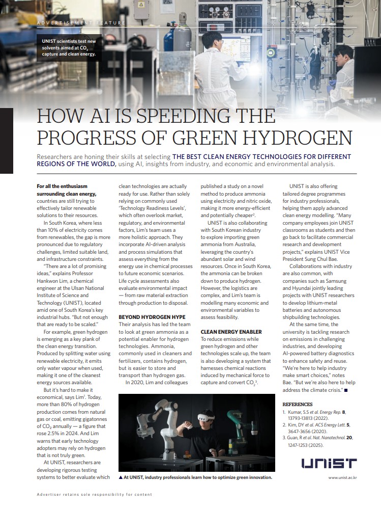 UNIST is featured in a branded content article published on Nature, in collaboration with Springer Nature, highlighting its research strengths in green hydrogen, AI-driven energy modeling, and industry-based innovation. Titled “How AI Is Speeding the Process of Green Hydrogen,” the article explores how UNIST researchers are applying AI, economic modeling, and real-world data to accelerate the deployment of scalable clean-energy technologies.